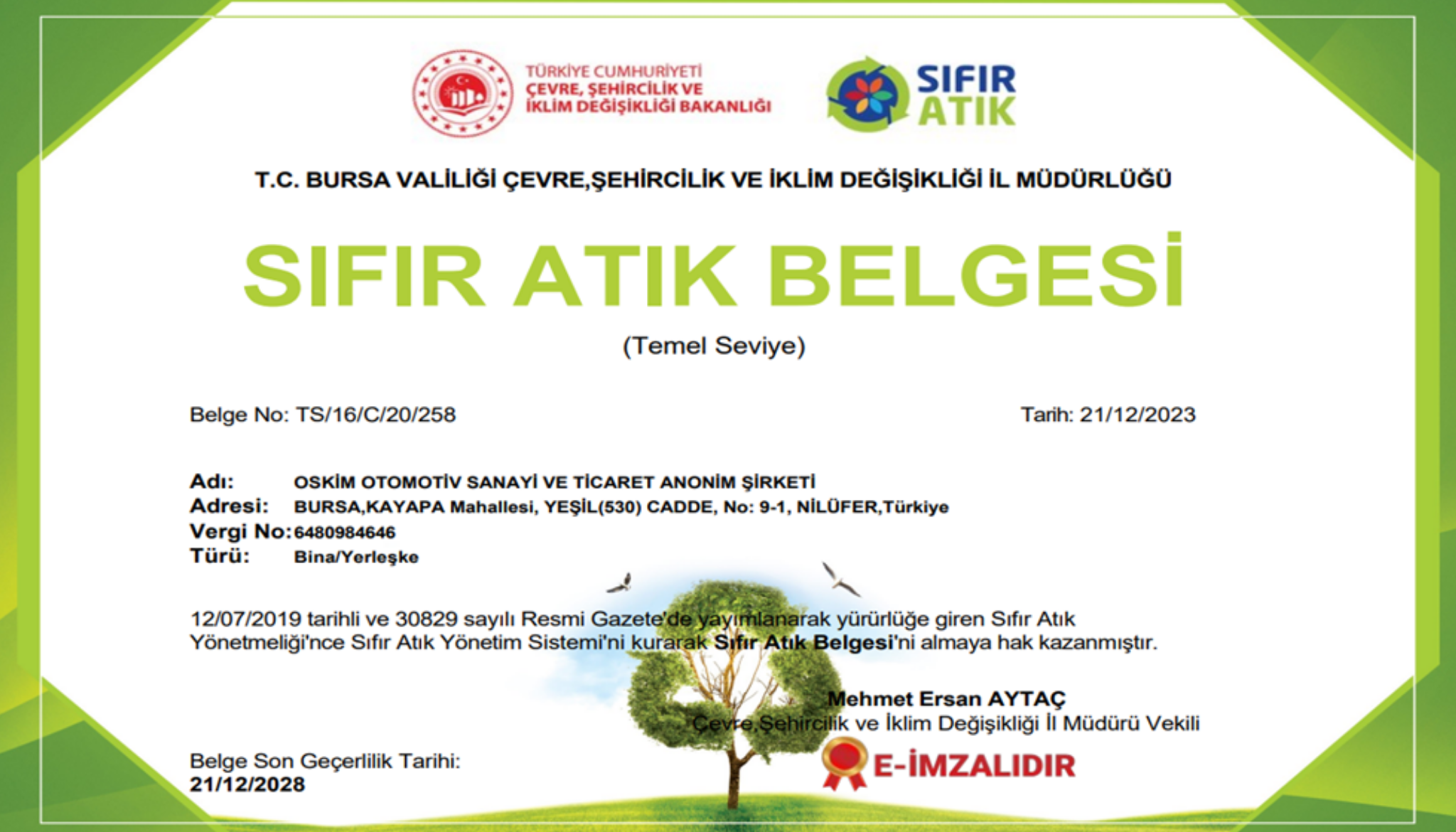Çevreye duyarlı üretim uygulamaları doğrultusunda, Çevre, Şehircilik ve İklim Değişikliği Bakanlığı tarafından verilen Temel Seviye Sıfır Atık Belgesi alınmıştır. Atıklar kaynağında ayrıştırılmakta, geri dönüştürülmekte ve gereksiz çevresel etkinin önlenmesi amacıyla oluşturulan Sıfır Atık Yönetim Sistemi kapsamında yönetilmektedir.